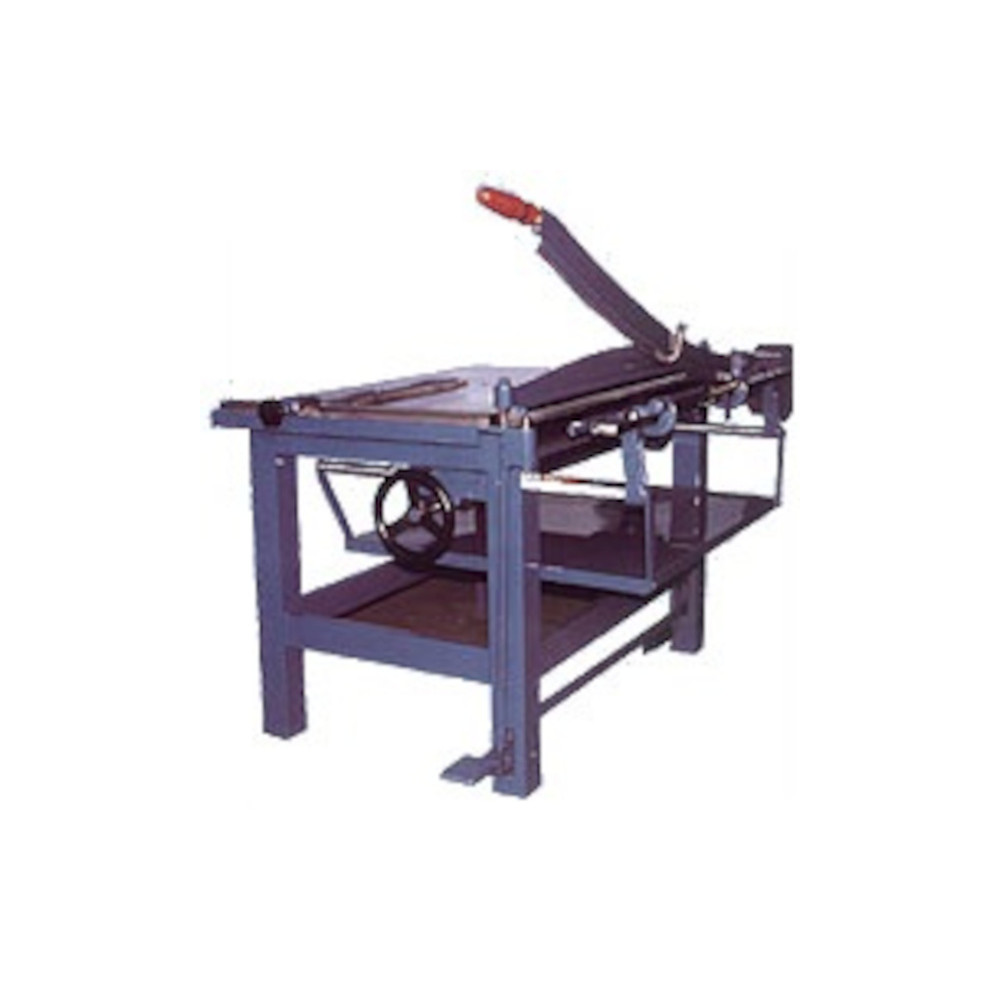 with tubular iron base and plated table. It is equipped with parallel square, strip-cutter, sliding longitudinal square, graduated rule divided into millimetres, graduated rack, pedal control, additional square rule, blade holder and steel blade.