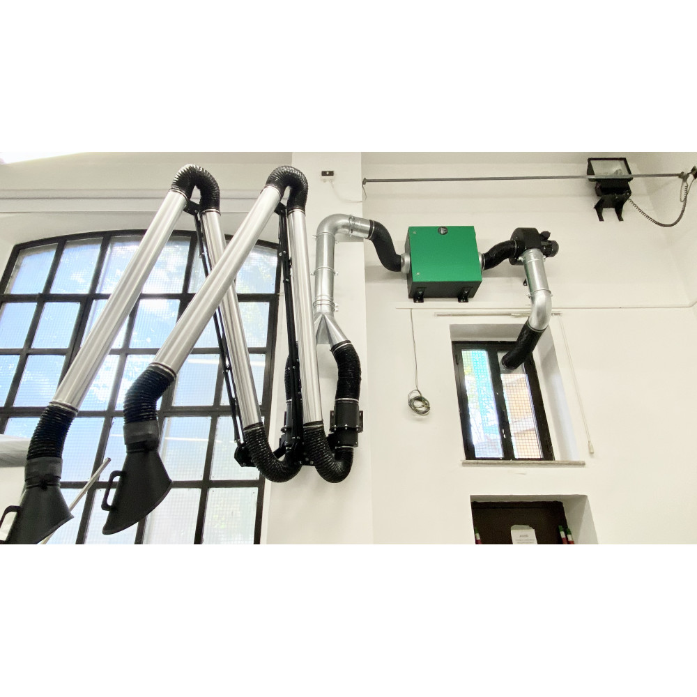 For powders, solvent vapors, acids, bases, with external expulsion. They are designed by CTS according to the available space, number of operators, and customer requirements.They are composed of an electric fan with a forward-curved centrifugal impeller, with variable power depending on the project.Optional soundproofing box and housing box for filters (dust and activated carbon).The self-supporting extraction arms, ARMOTECH model, Ø 125 mm, have a variable length from 2 to 4 m; external pantograph structure with pistons, in anodized steel-aluminum, rigid pre-coated aluminum tube, flexible tube connection joints, and painted sheet metal hood with handle, regulation damper, and internal protective grid.