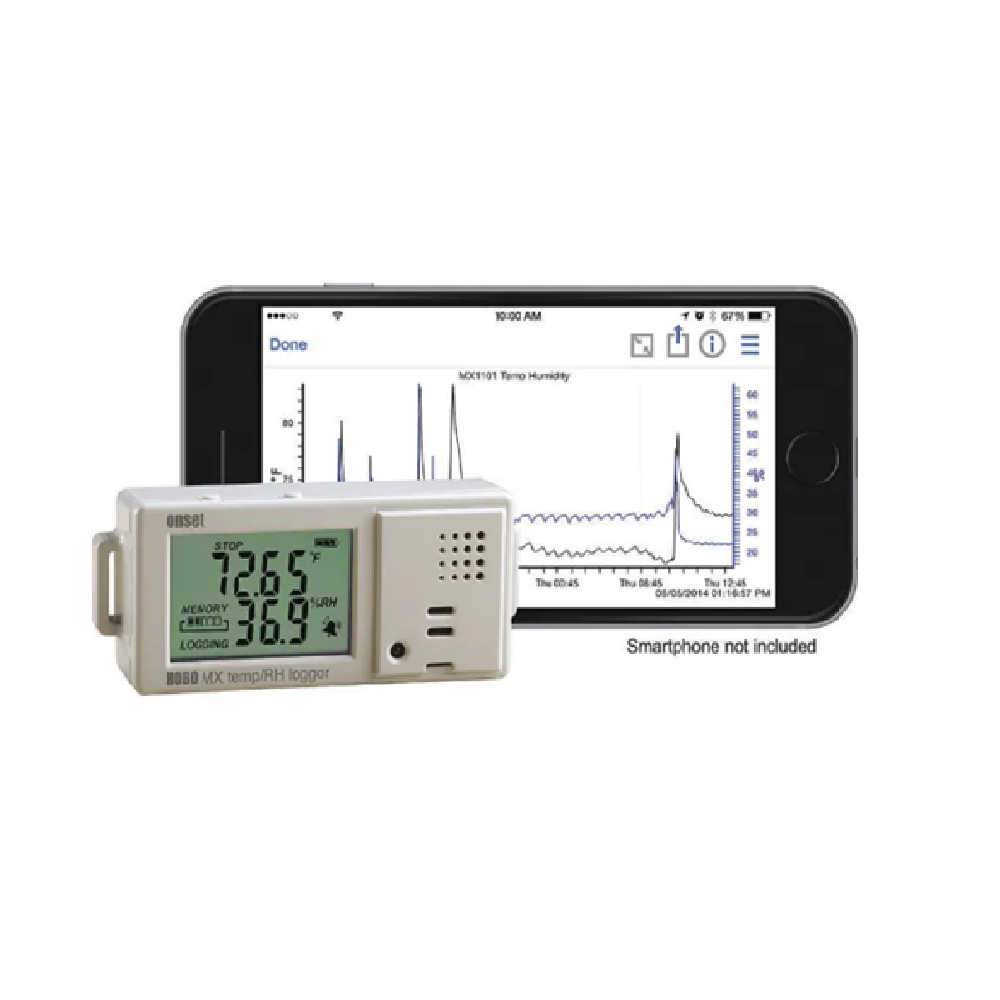 Wireless data transmission via Bluetooth (up to 30 meters) to an Android or iOS device using the free HOBOmobile app, which allows programming, viewing and downloading data, configuring alarms, and sharing files easily and quickly; to use and process the data, the additional analysis software HOBOWare must be acquired.