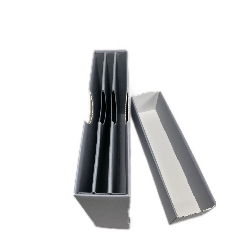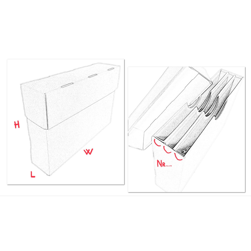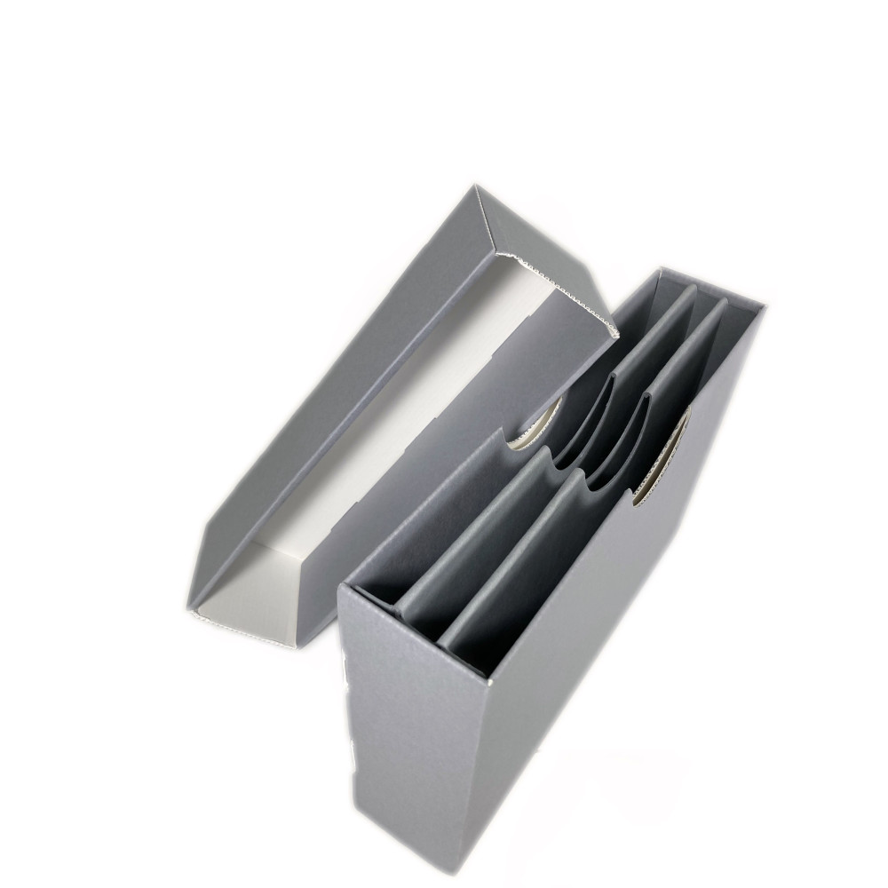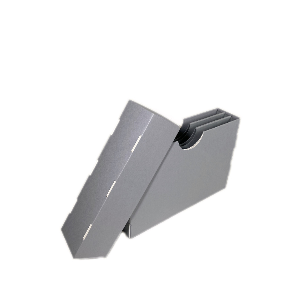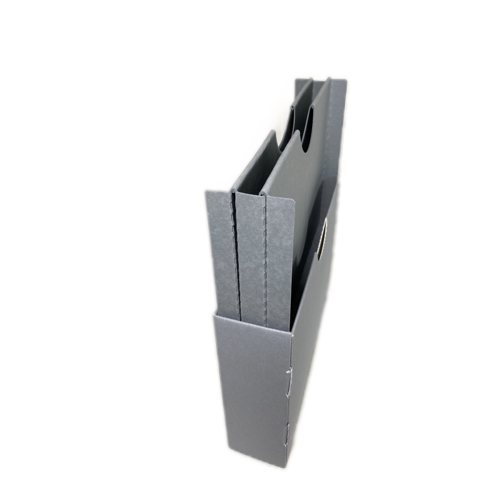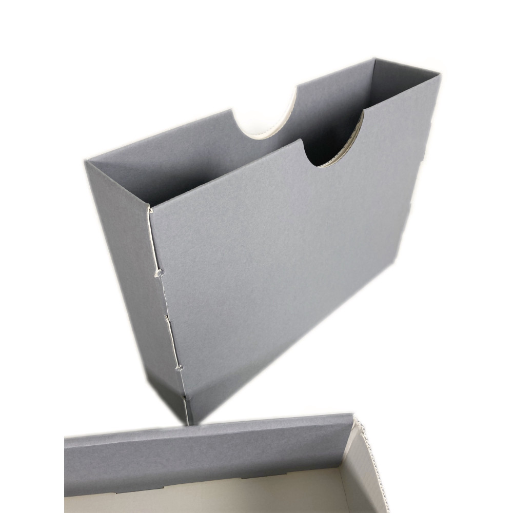 Las cajas con tapa abatible "D`annunzio" se realizan con cartón de conservación Duralong Wave (caja exterior) y cartón Duralong Special (sectores interiores); ideales para el archivo vertical, aptas sobretodo para negativos en placas de vidrio de gran tamaño o de obras varias. La robusta y sólida estructura, con paredes dobles en todos los lados de la base y de la tapa, evita deformaciones de la caja y la hace adecuada para el archivo, también sobrepuesta, de obras especialmente frágiles y de peso considerable. Los sectores interiores, realizados tipo "acordeón", se pueden extraer completamente y permiten una conservación segura de las obras en vertical, evitando el contacto. Fáciles y rápidas de montar gracias a las solapas autoblocantes que se intruducen en la doble pared. Carton Duralong Wave ( grosor 1,8 mm) Carton Duralong Special (grosor 0,9 mm)