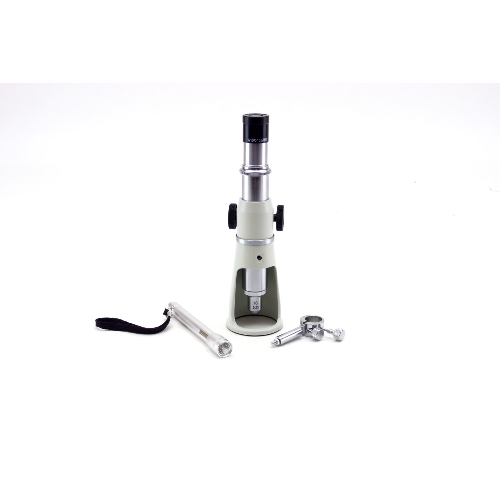 - a metallic body with 10x achromatic objective and focusing controlled by a rack and pinion mechanism;