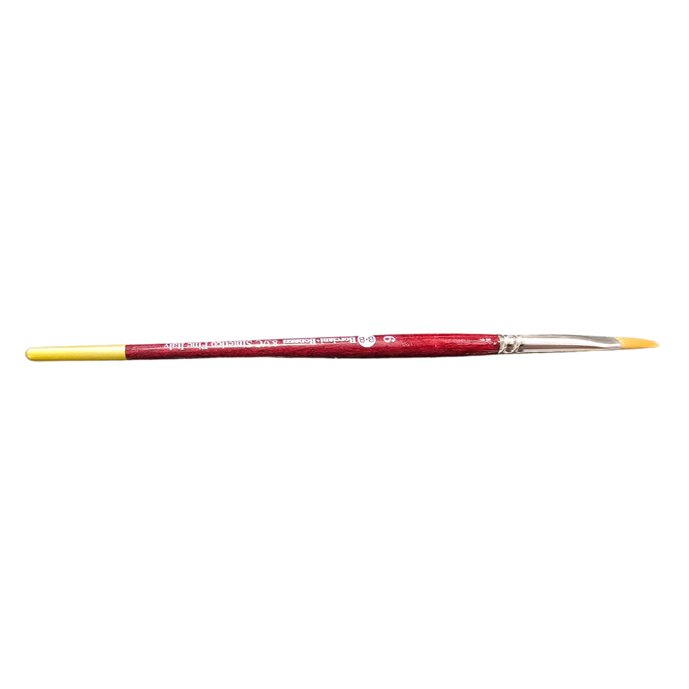 de fino pelo sintético dorado, con virola de latón niquelado y mango corto de madera lacada en rojo/oro.