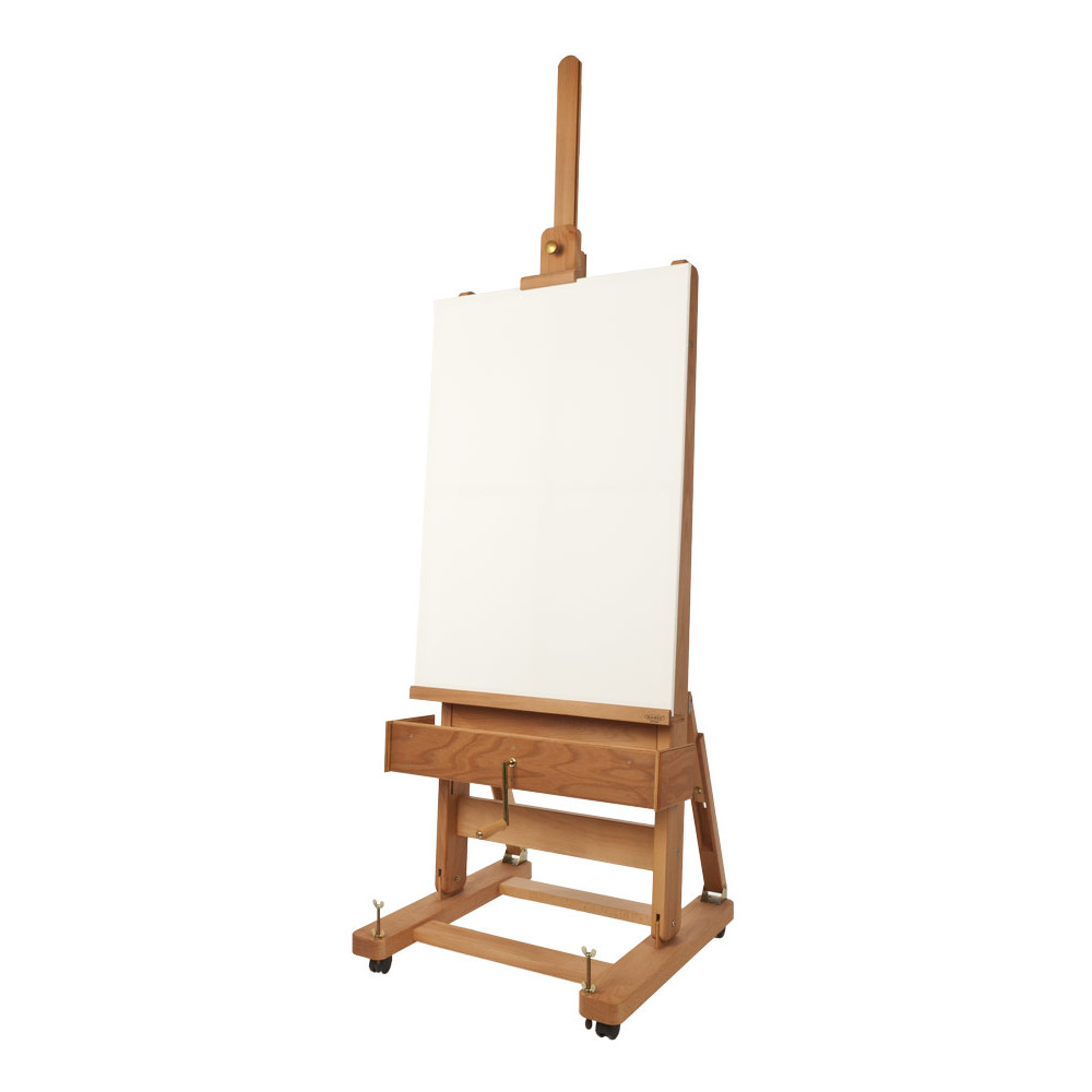 En bois de hêtre huilé et résistant aux taches, hauteur du support de toile réglable par un mécanisme à manivelle, angle de travail réglable, le mât et la toile sont bloqués dans la position souhaitée en serrant les vis à l'arrière, deux tiroirs latéraux et une base robuste avec quatre roulettes et des boulons de mise à niveau.