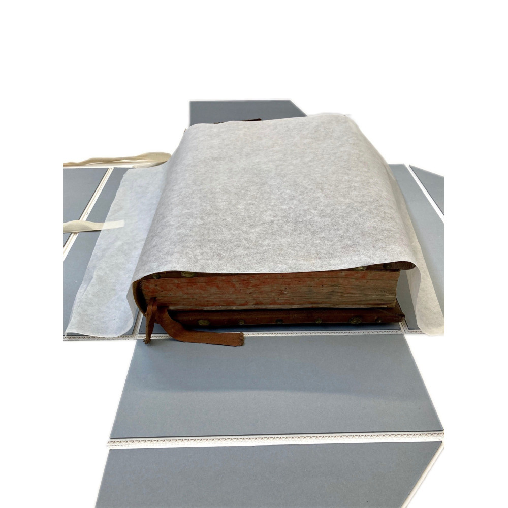 Les classeurs-dossiers à rabat "Morandi" sont réalisés avec le carton de conservation Duralong Wave de 5,0 mm d`épaisseur, à l`extérieur, et le carton Duralong Special de 1,8 mm en renforcement intérieur, sur tous les parois. Idéals pour la conservation verticale ou horizontale d`œuvres manufacturées de poids et de dimensions importantes, tels que les missels. Utiles également pour les registres ou documents non reliés dans des dossiers ou des enveloppes. Ils sont conçus pour assurer une résistance et une protection maximale. La découpe au traceur de la partie extérieure (coupe en "V") facilite grandement le pliage; les lanières de coton épilé de hauteur majorée (2,5 mm), assurent une fermeture sûre et durable.