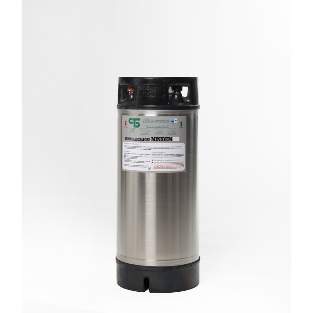 for demineralizer MOD. MINIDEM 30 in stainless steel with practical handling handles, supplied complete with inlet/outlet quick-release connections and upper lid. It is filled with 30 liters of demineralizing mixed-bed resins (cationic/anionic) with high exchange power.