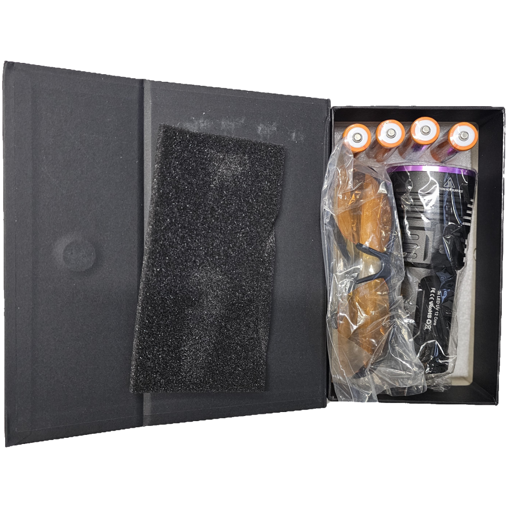 La lampe de poche prend en charge le chargement USB-C, ce qui rend le processus de chargement plus pratique ; Il est équipé de 4 batteries rechargeables de 2000 mAh, d'un câble de chargement USB et d'une paire de lunettes de protection UV.
