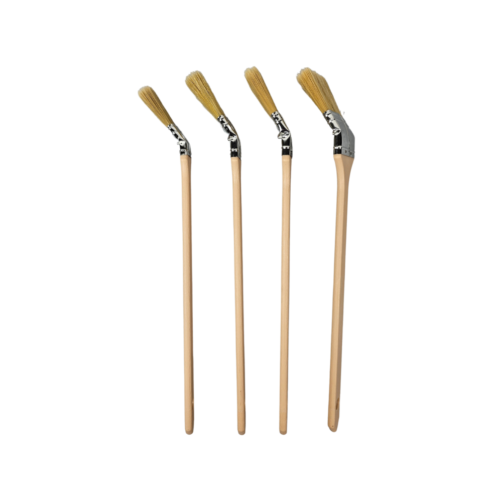 en poils blonds, virole nickelée et long manche en bois courbé.