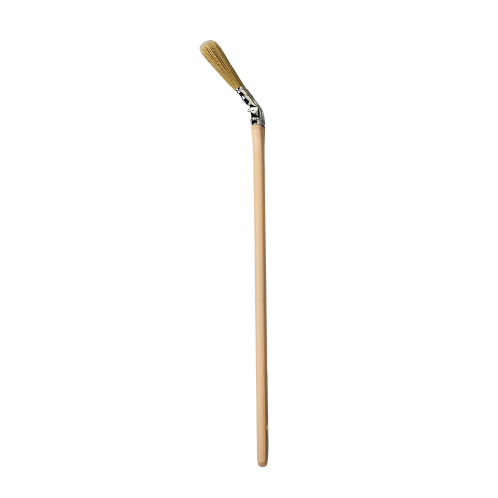 en poils blonds, virole nickelée et long manche en bois courbé.