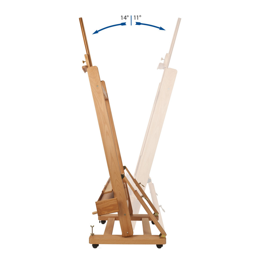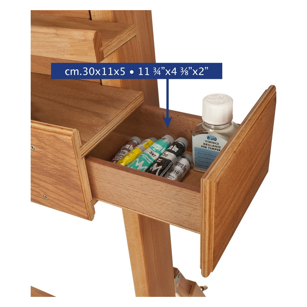 En bois de hêtre huilé et résistant aux taches, hauteur du support de toile réglable par un mécanisme à manivelle, angle de travail réglable, le mât et la toile sont bloqués dans la position souhaitée en serrant les vis à l'arrière, deux tiroirs latéraux et une base robuste avec quatre roulettes et des boulons de mise à niveau.